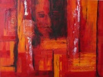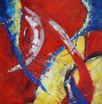 2011Beweging in rood en blauw. Relief door gebruik van diverse materialen. Grotendeels gemaakt met paletmes.